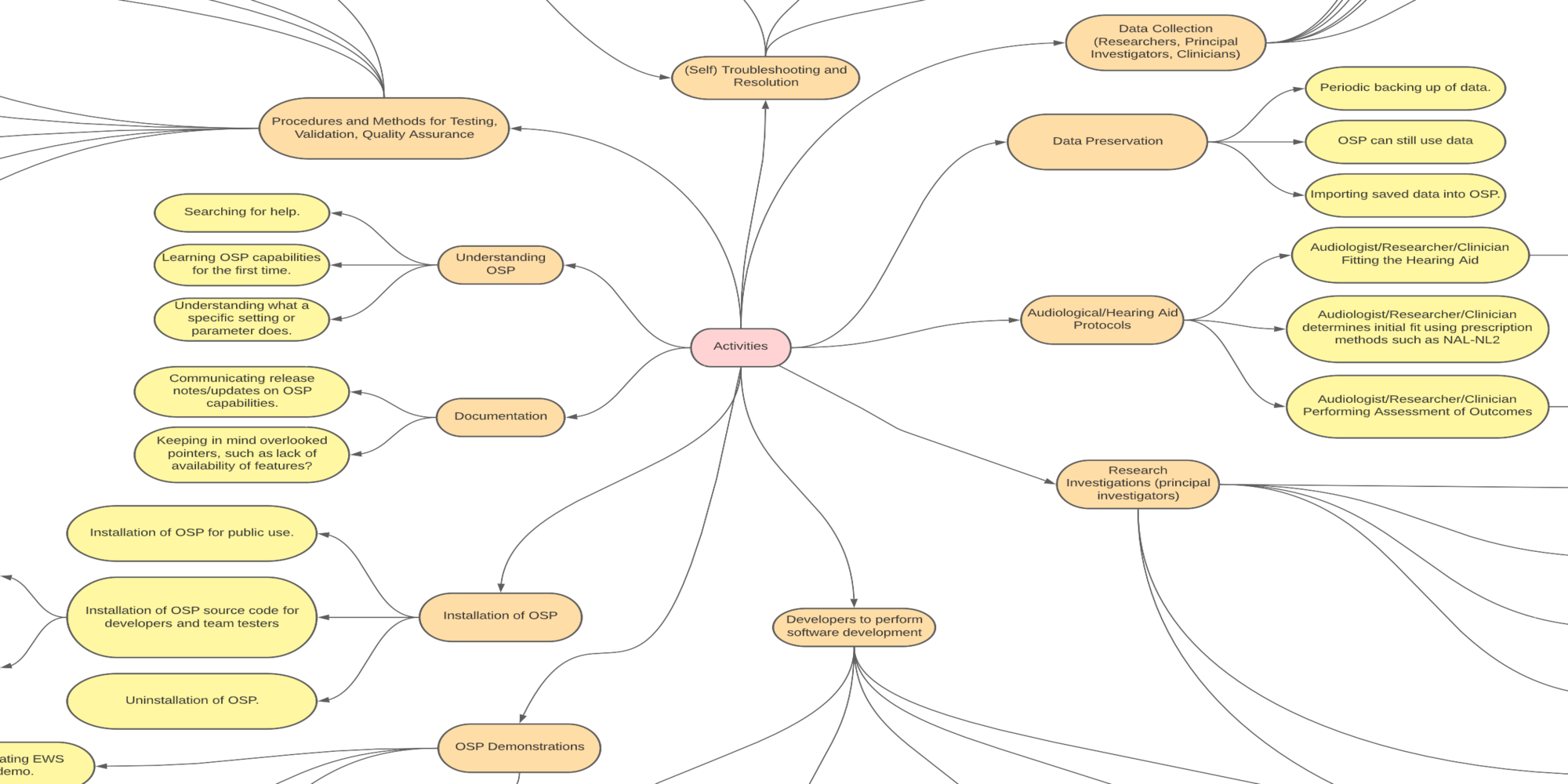 Mind map of OSP related activities: onboarding experience of OSP, software activities for developers, OSP usage for research investigations, etc. View via LucidChart.Tagging of different quotes from OSP-related publication (by Louis Pisha) based on different types of problem spaces using Miro tool: OSP's relation to the real world, OSP's impact, etc.Sorting raw data into different problem spaces, then extrapolating summarized insights for each problem space using Miro.